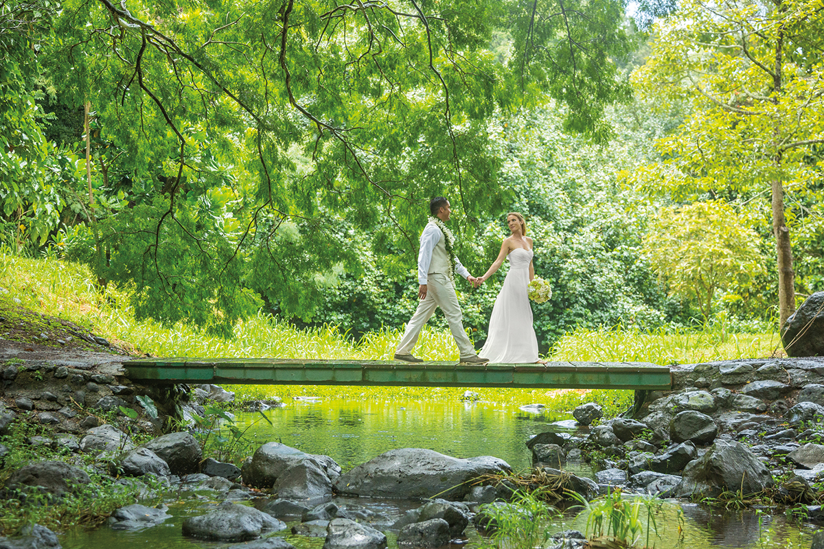 Bride And Groom Walking On Bridge In Tropical Garden South